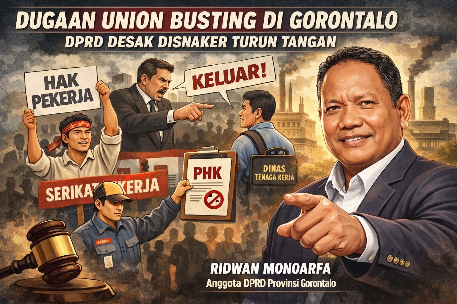GORONTALO — Wakil Ketua DPRD Provinsi Gorontalo, Ridwan Monoarfa, menyoroti dugaan praktik union busting yang dilakukan oleh salah satu perusahaan terhadap karyawan yang berupaya memperjuangkan hak melalui serikat pekerja.